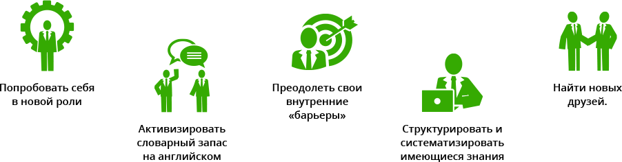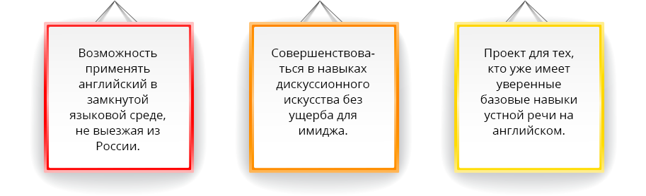 Структура встречи выстроена таким образом, что вы неизбежно задействуете все аспекты восприятия и воспроизведения «живой» английской речи, решая поставленные модератором задачи. И все это в замкнутой языковой среде! На встрече присутствуют носители, которые щедро раздают «желтые» карточки за использование русских слов. Красная карточка и удаление с поля на 2 минуты за второе русское слово.